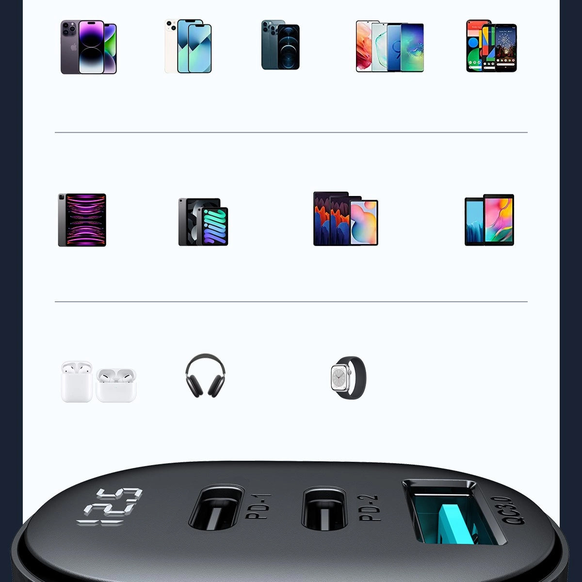 Biladeren Joyroom JR-CCD04 tilbyr maksimal kraft og komfort med opptil 30W. Utstyrt med to USB-C porter og en USB-A port,