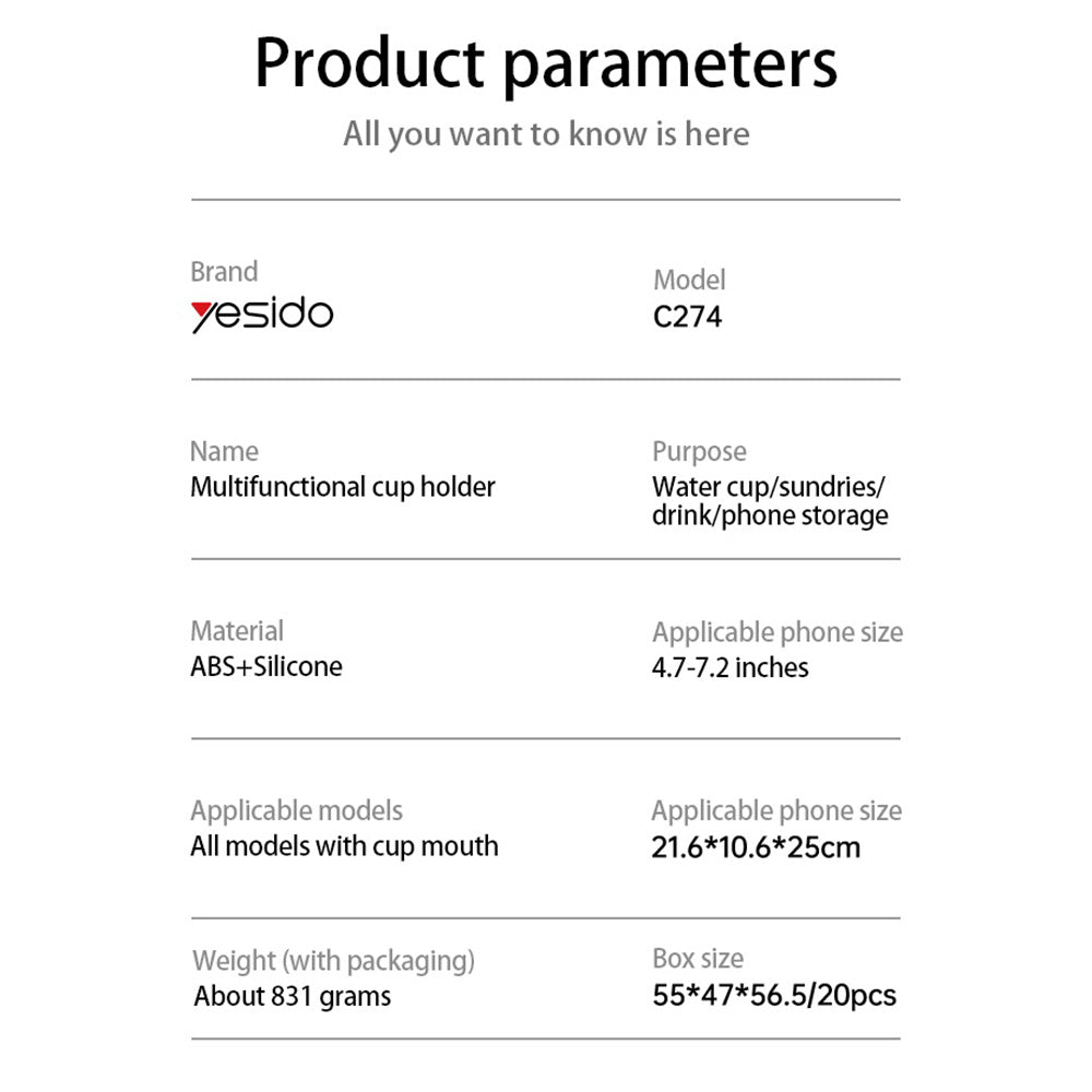 Yesido C274 er en multifunksjonell 4-i-1 bilholder, designet for sjåfører som ønsker orden, stabilitet og maksimal funksjonalitet i bilens interiør.