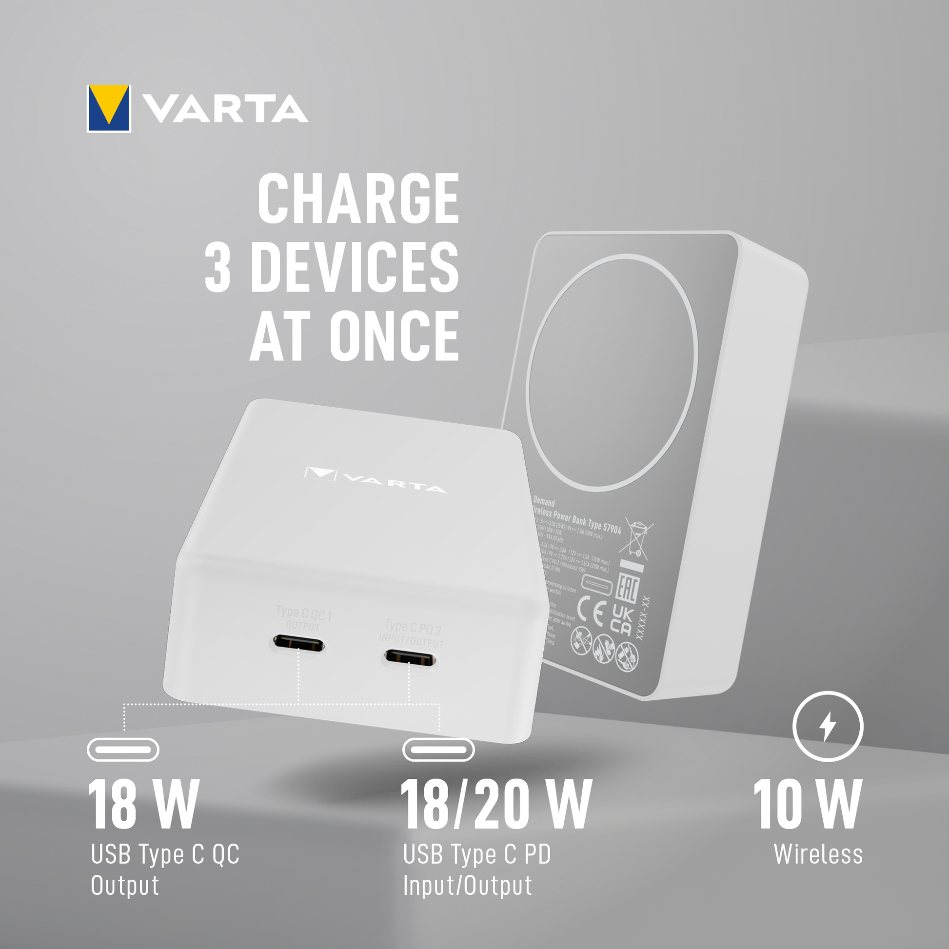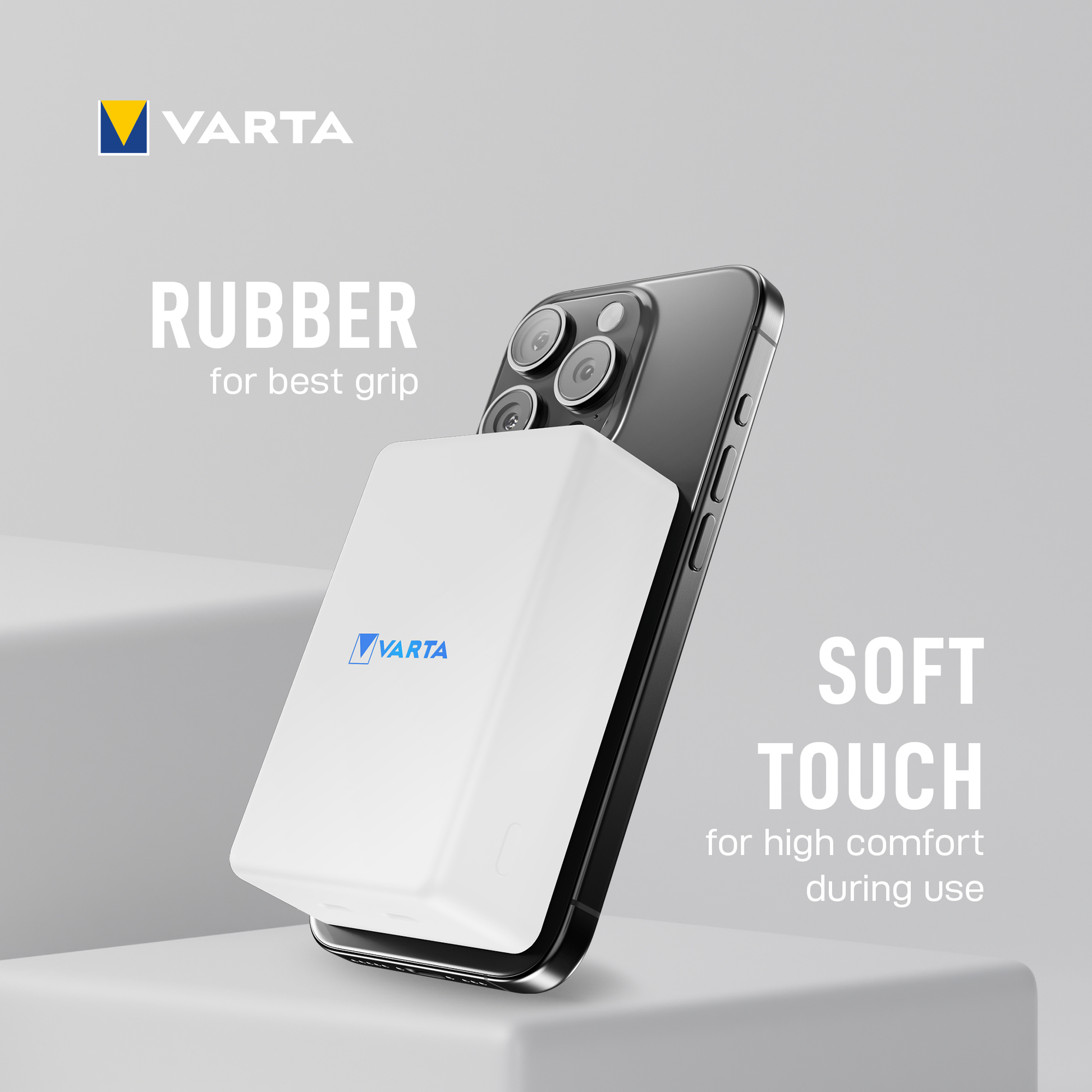 Magnetisk teknologi muliggjør rask og sikker tilkobling, og sikrer perfekt justering mellom enhet og batteri. Overflaten med soft touch tekstur gir høy komfort, og det opplyste VARTA-logoen viser gjenværende ladningsnivå. Ideelt for samtidig lading,