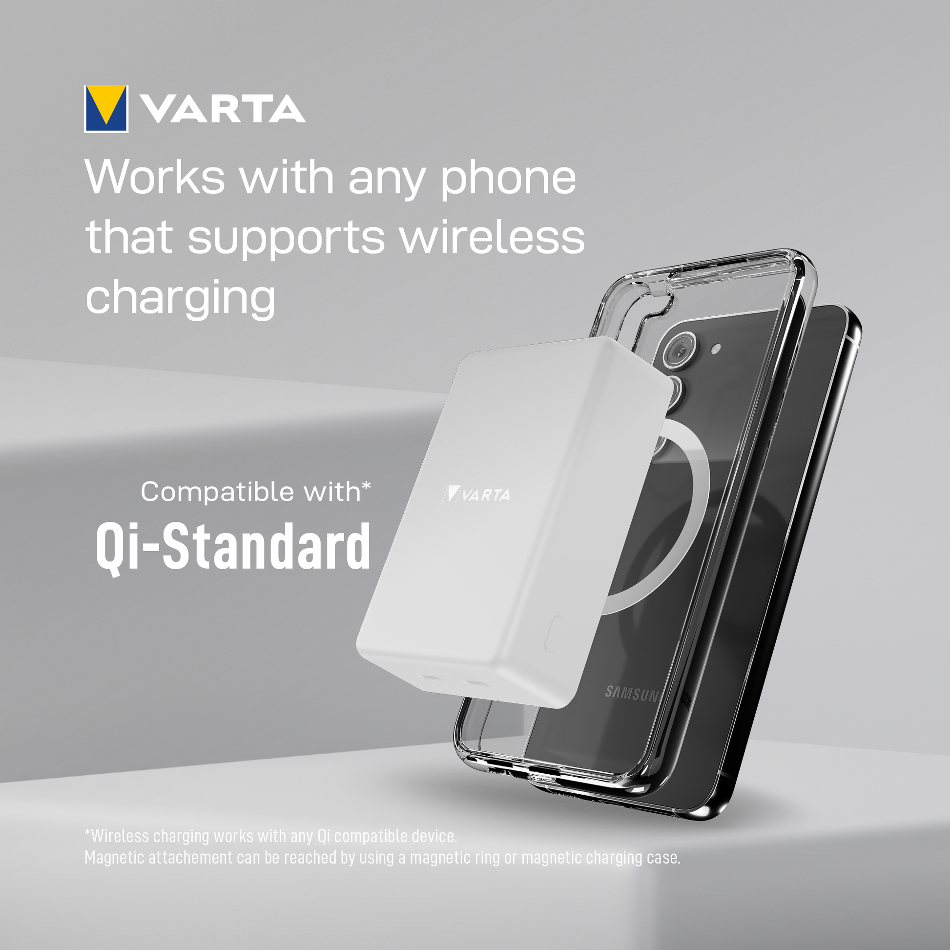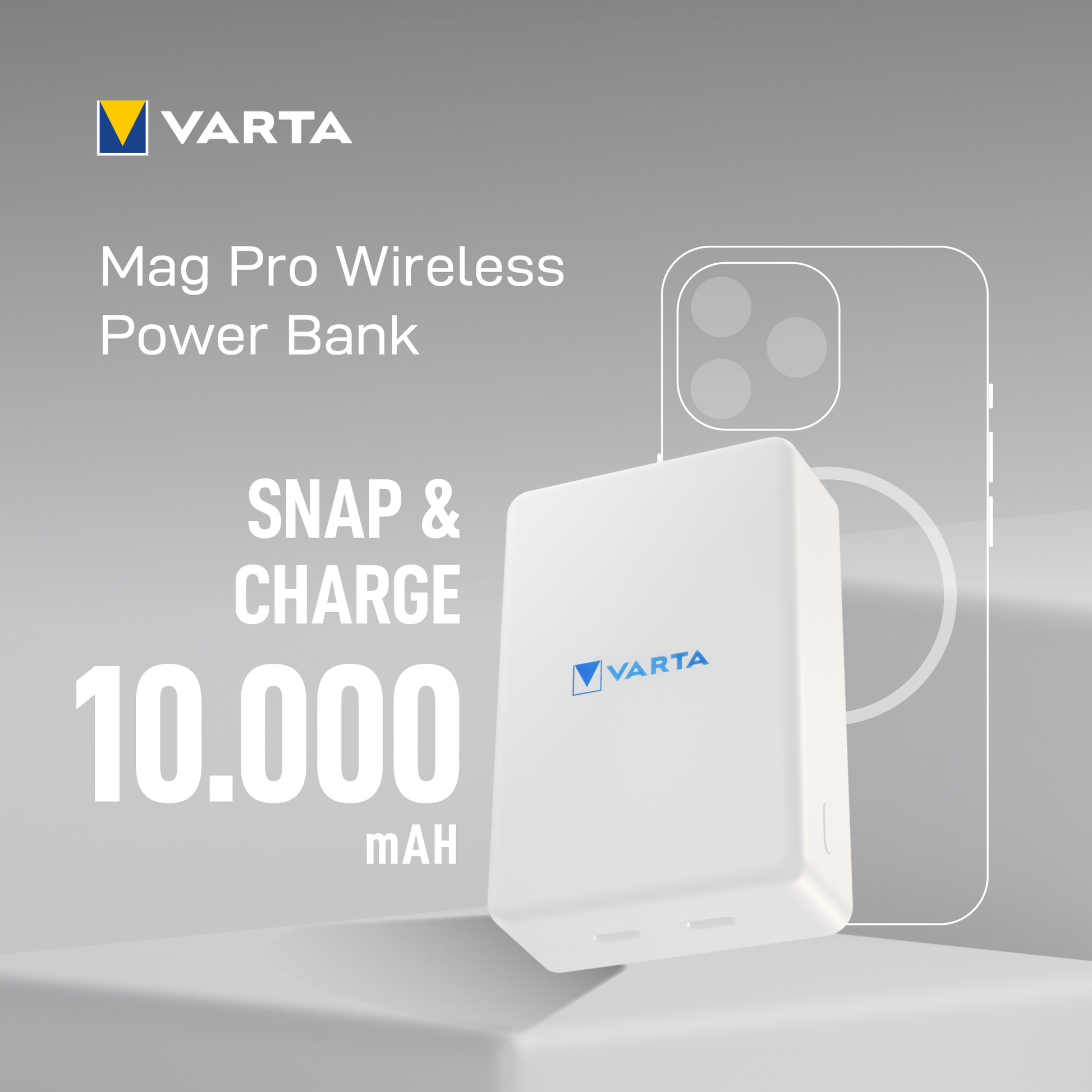 Vær alltid forberedt med det eksterne trådløse batteriet VARTA Mag Pro, et kraftig og elegant tilbehør som holder enhetene dine ladet til enhver tid.