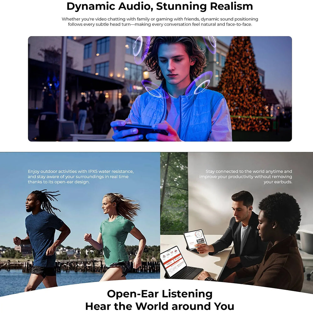 Med et open-ear design som fester seg diskret, forblir Bluetooth-øretelefonene komfortable hele dagen uten å legge press på øregangene.