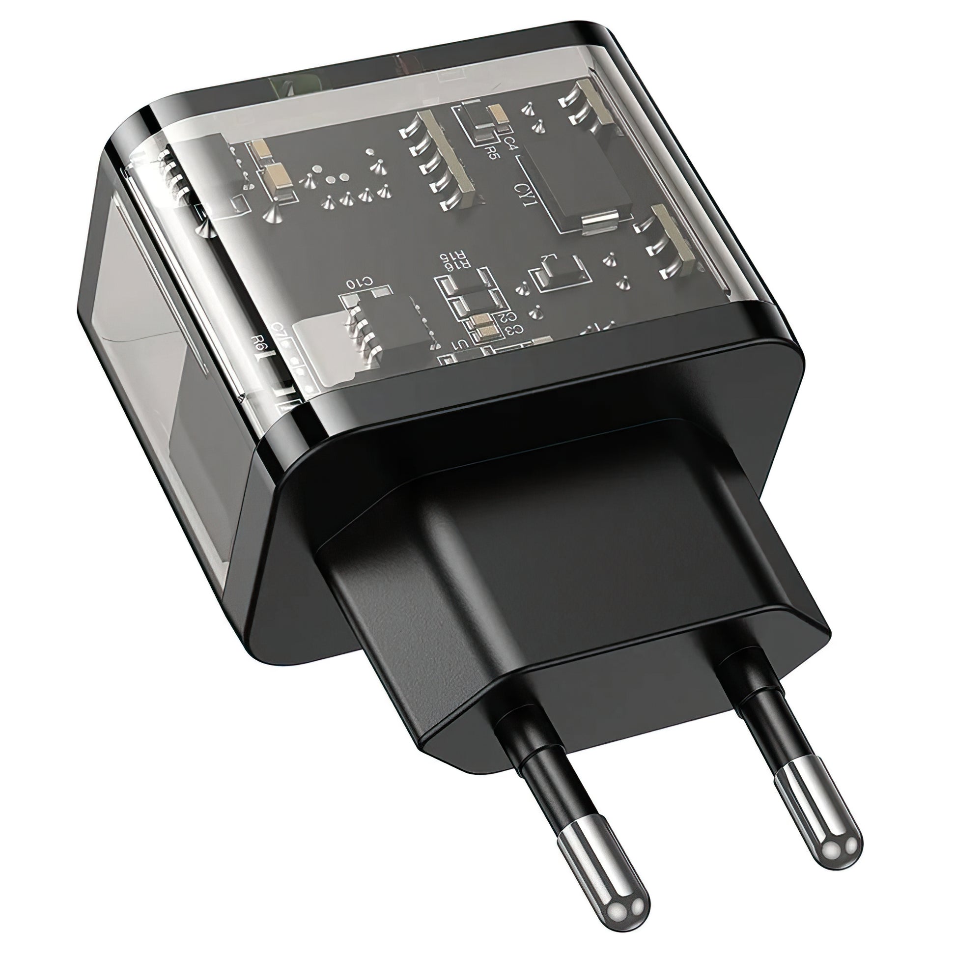 Hoco N34 er en gjennomsiktig vegg-lader med hurtiglading og dobbel utgang, ideell for effektiv strømforsyning av to enheter samtidig.