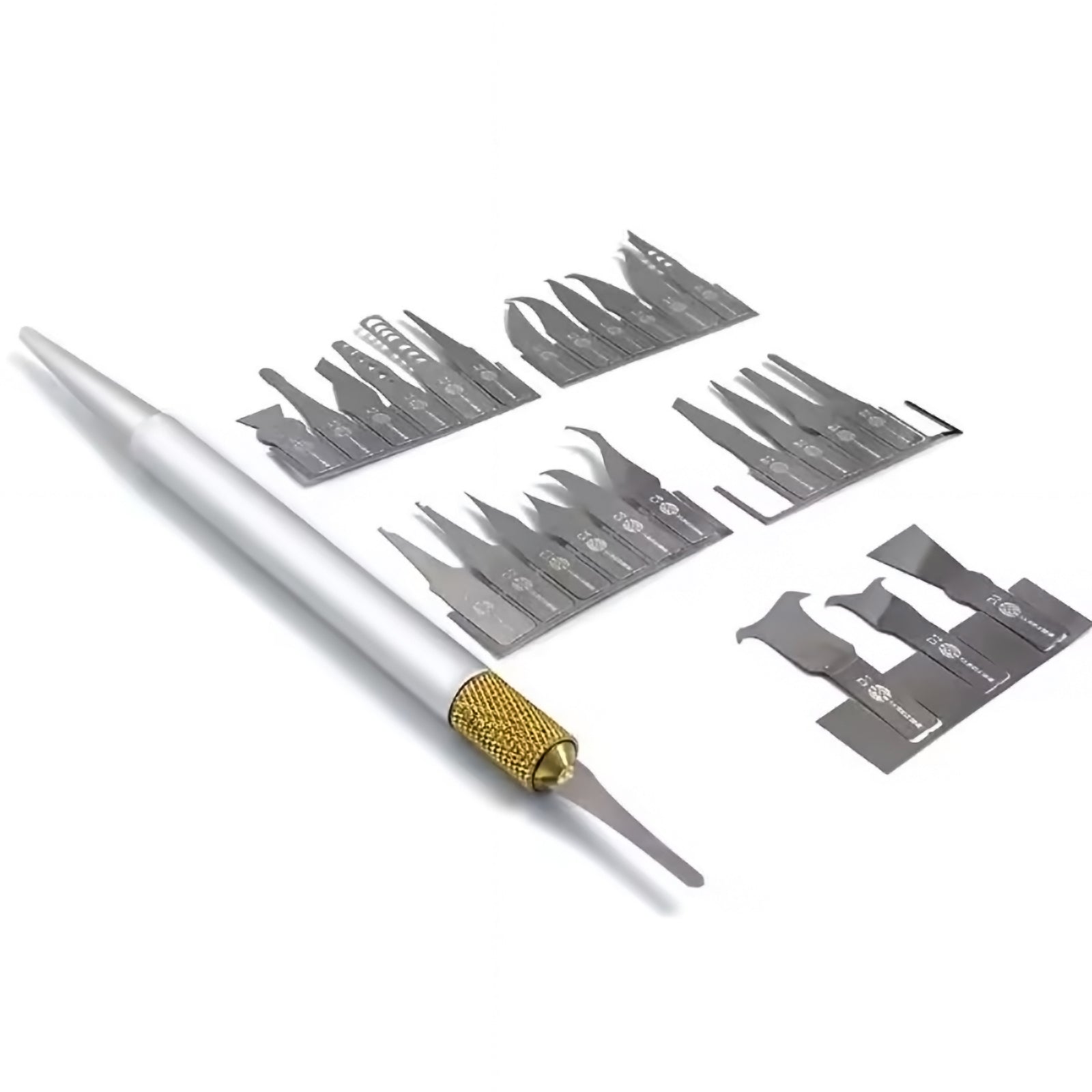 fra hovedkortene til mobiltelefoner. Settet inkluderer 27 ultratynne blader og et ergonomisk pennformet håndtak,