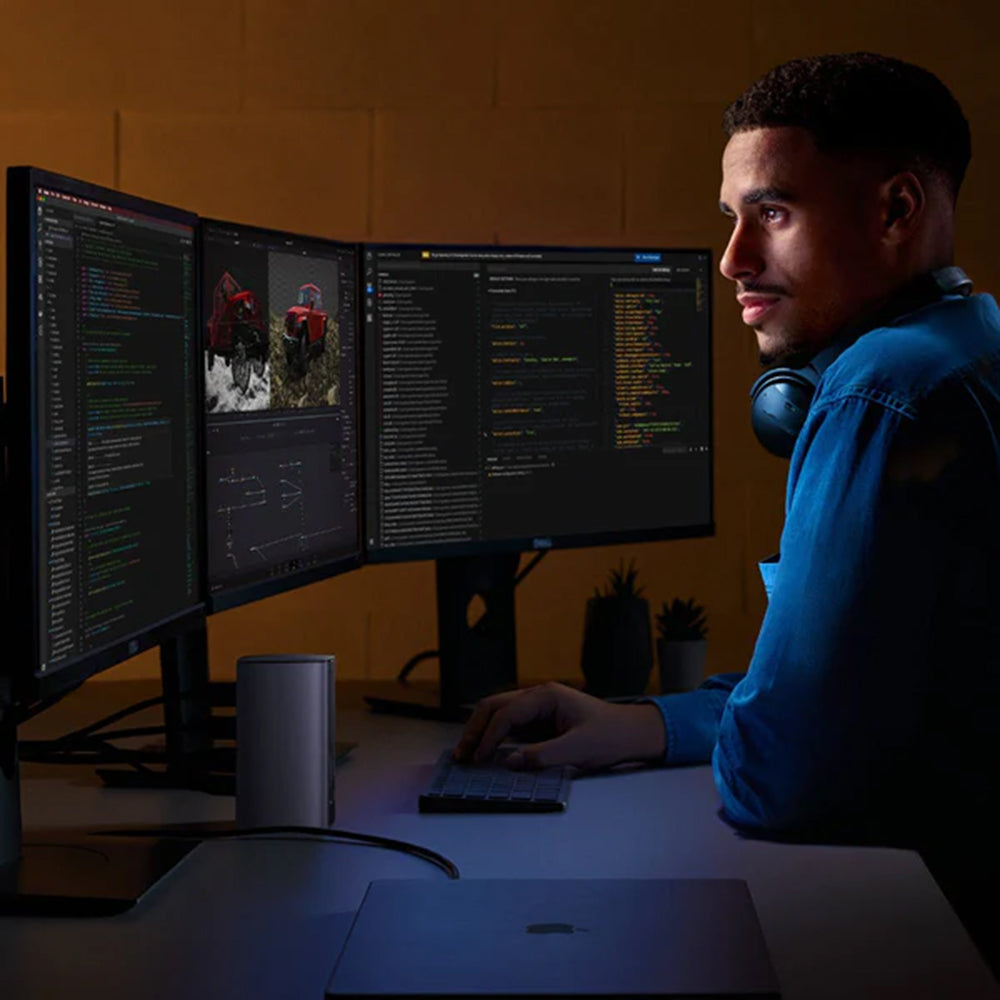 Laget av premium aluminium, kombinerer den eleganse med holdbarhet. Den har 3 video utganger (HDMI 2.1 8K, HDMI 2.0 4K, DisplayPort 1.2 4K),