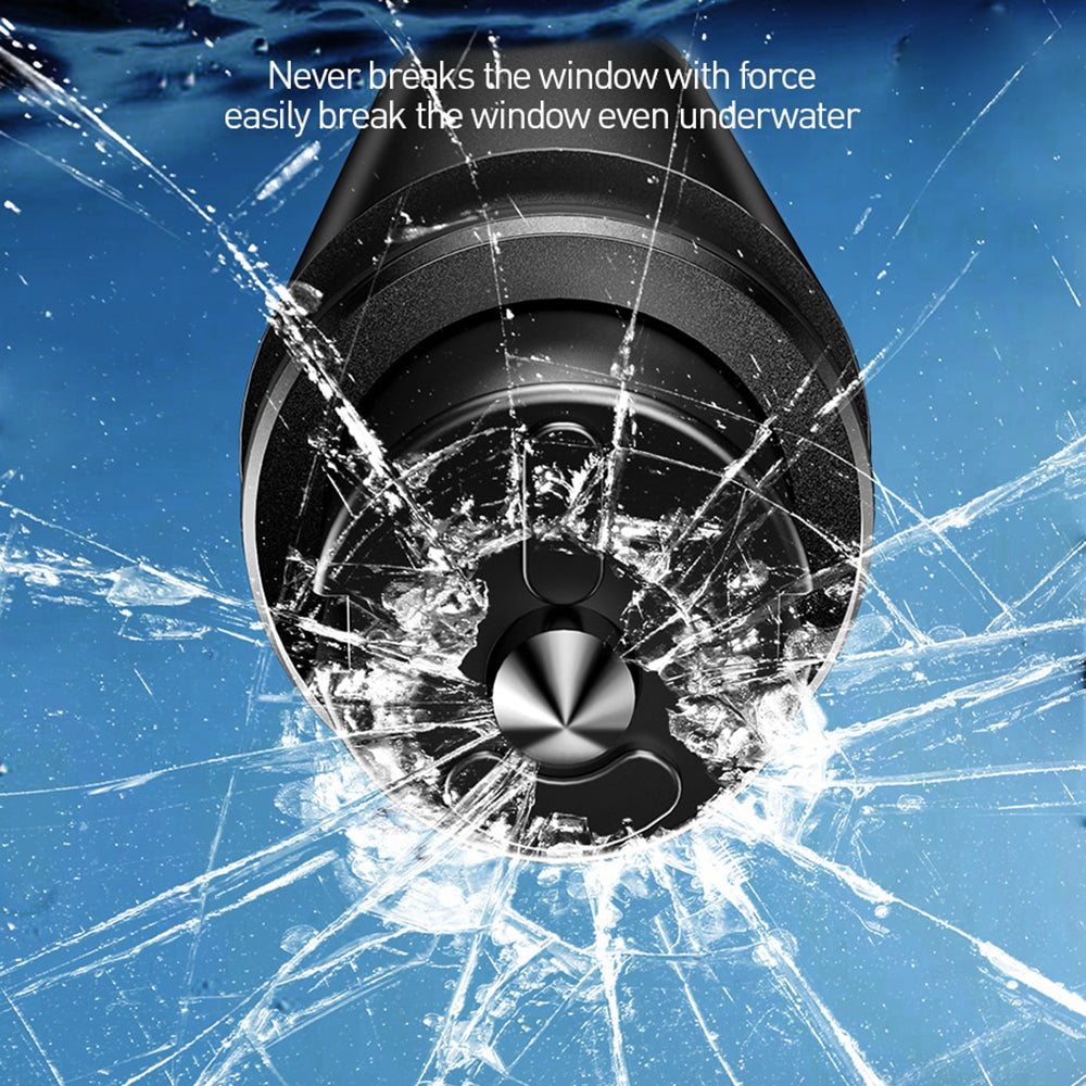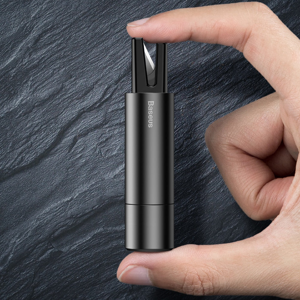 Inne i gadgeten er det innebygd et super skarpt blad for rask kutting av sikkerhetsbelter i tilfelle en ulykke.
