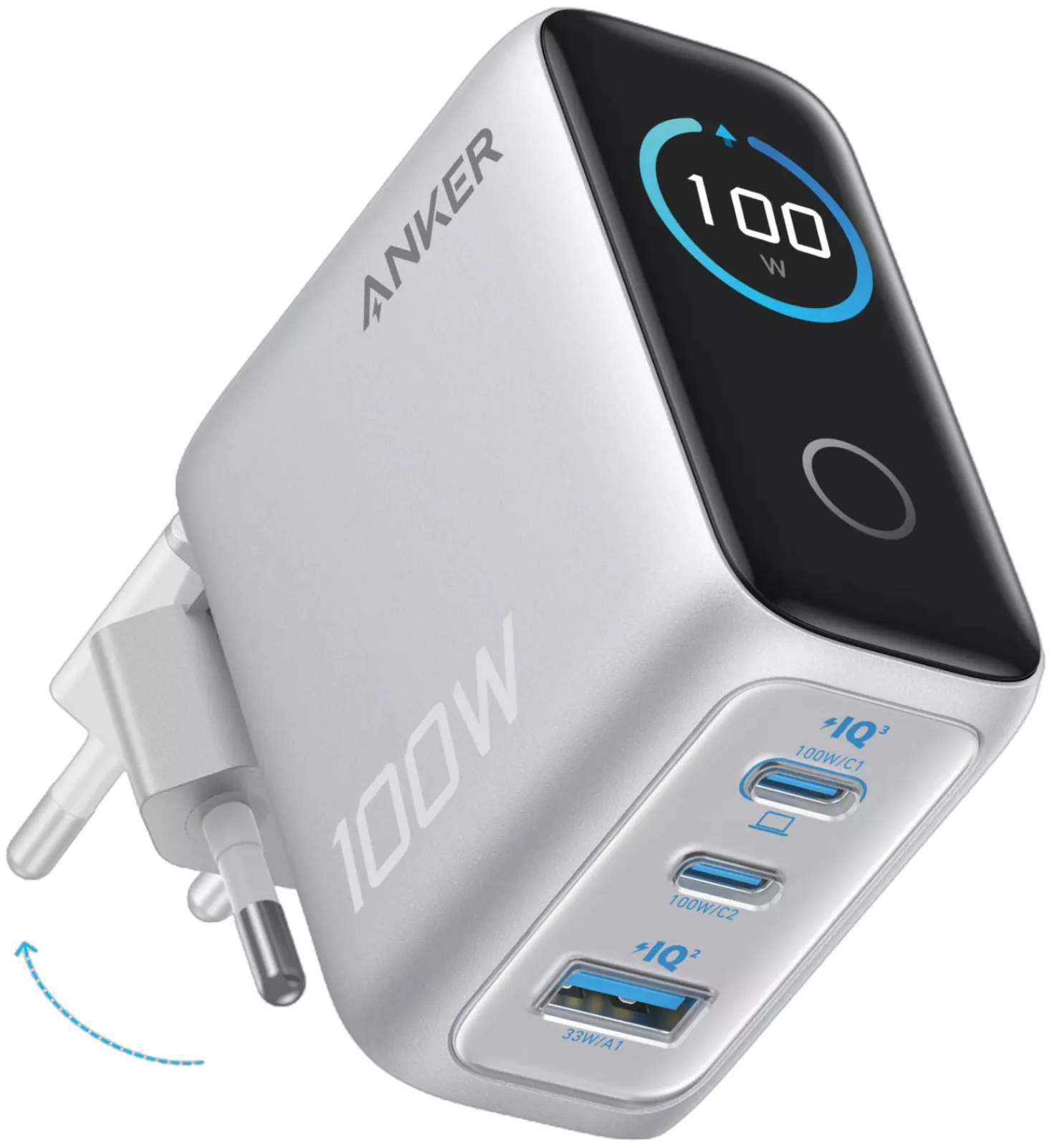 Anker-nettladeren med 3 porter og smart skjerm tilbyr 100W kraft gjennom avansert GaN-teknologi, som lar deg lade bærbare datamaskiner, telefoner og nettbrett samtidig.