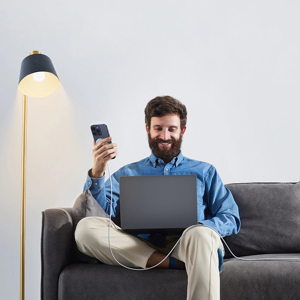 uten ekstra kabler. Den er utstyrt med en integrert USB-C-kabel, 1.5 meter lang, med tekstilbeskyttelse mot slitasje og floker.
