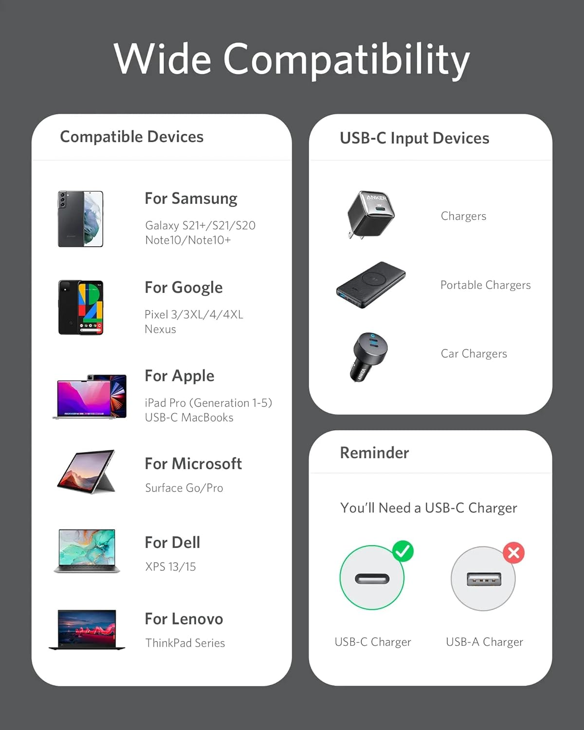 100W, er Anker PowerLine III-kabelen kompatibel med et bredt spekter av USB-C-enheter, inkludert smarttelefoner, nettbrett og